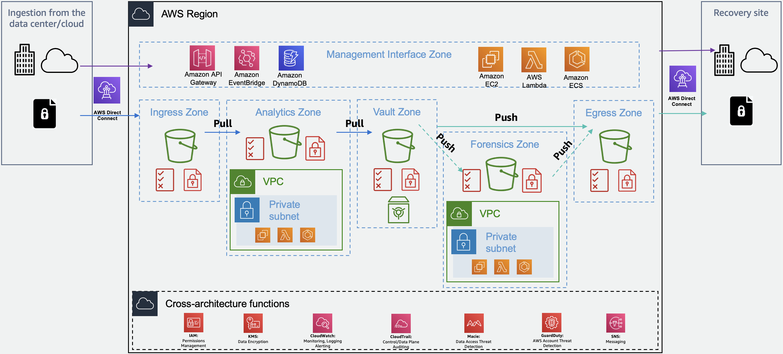 In the architecture above, Air-gapping is achieved by creating a vault zone outside of the primary AWS organization that isolates critical data from the production environment and the internet in an immutable / WORM model. This isolation is maintained using network controls and access controls, such as next-generation firewalls and zero trust frameworks. The vault zone is kept unreachable from the outside, and data is pulled into the vault from various sources rather than pushed, adding an additional layer of protection. The architecture also includes Ingress and Egress zones which are ephemeral in nature and provides a digital air gap, ensuring that the vault remains secure and isolated from potential threats.